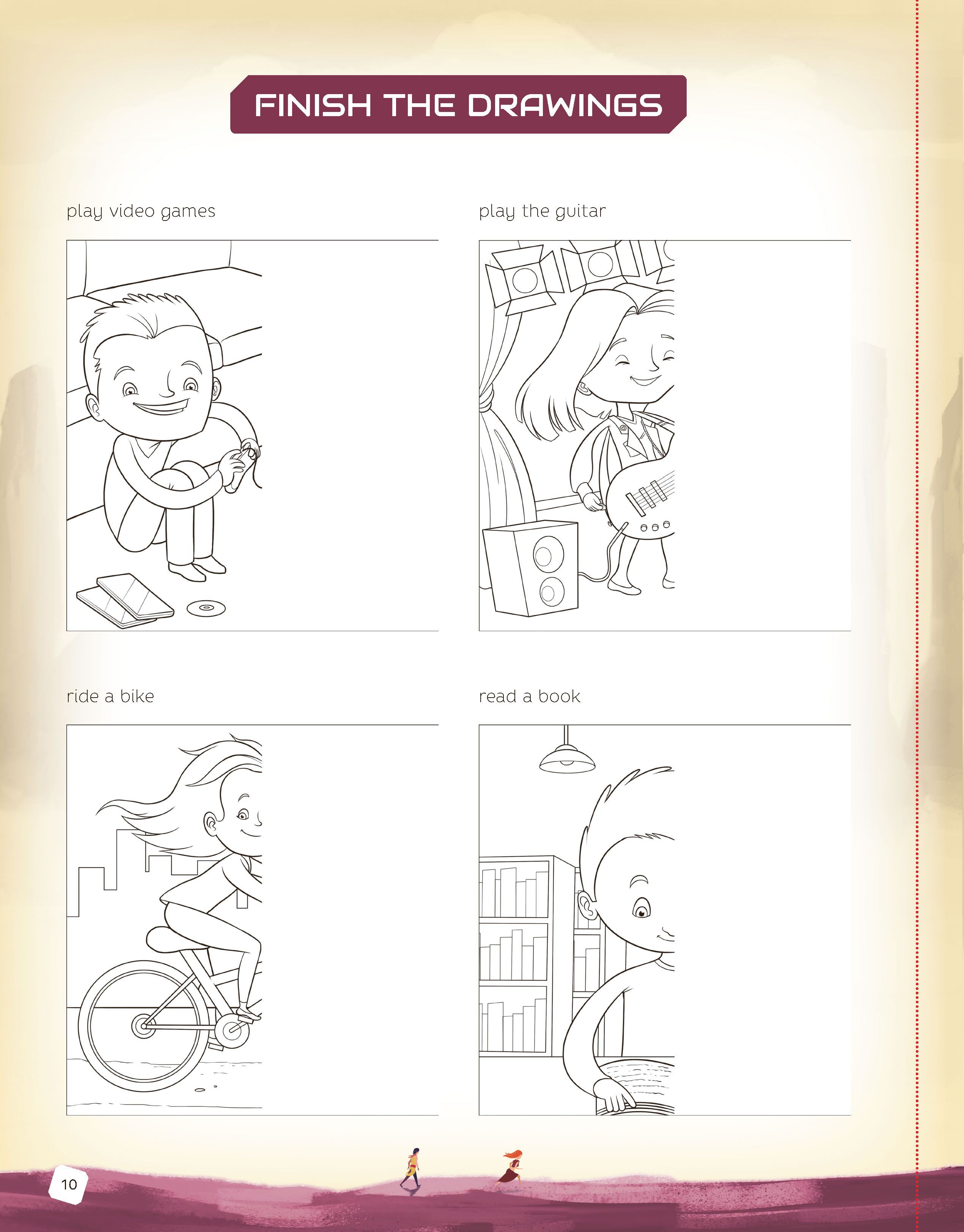 • Explain that they must finish the drawings by themselves. After finishing the drawings, they need to write a sentence about each action. Set a time limit for students to do the activity. Walk around the classroom and monitor their work.