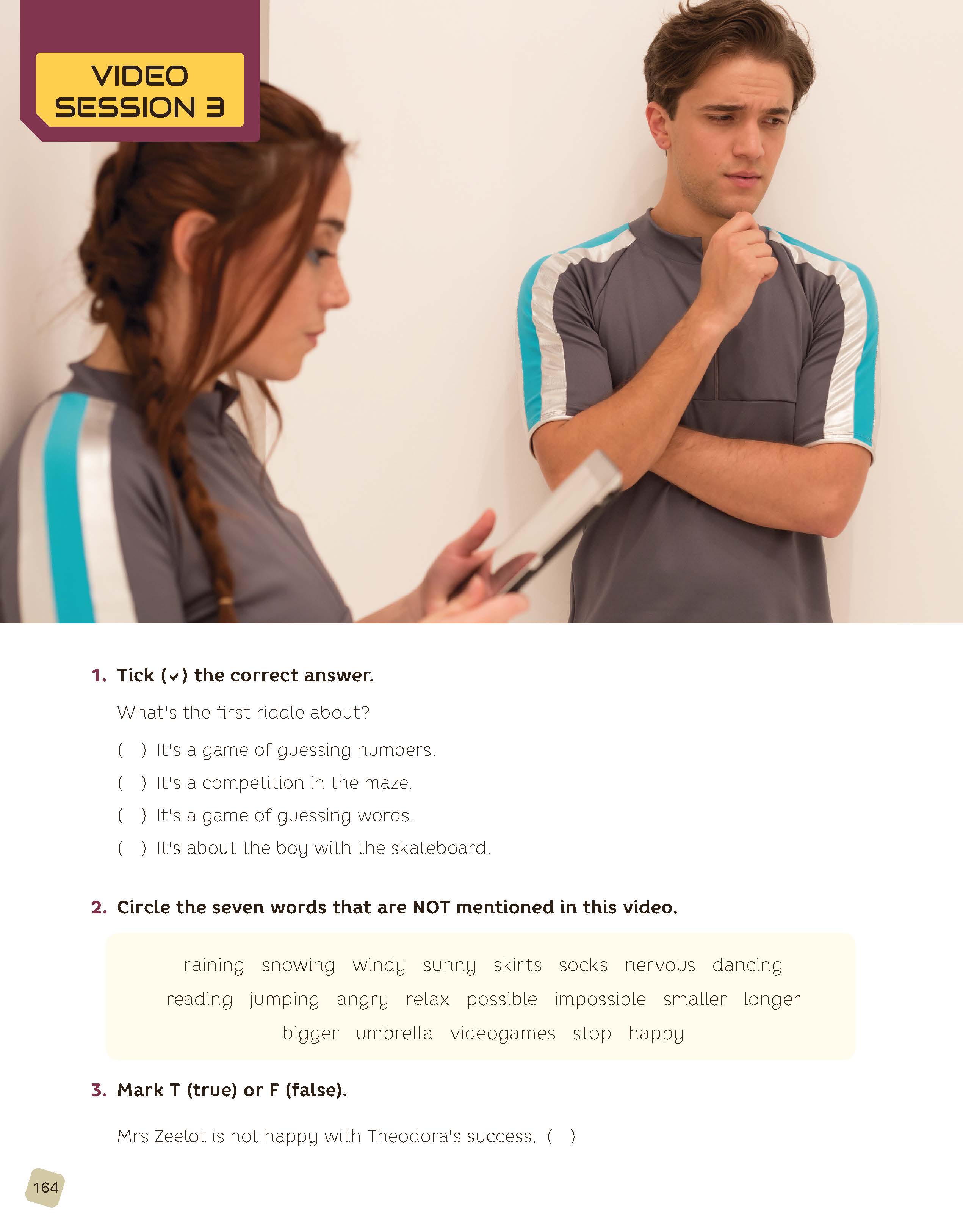 • Exercises 1 and 2: Ask students to open the Workbook to page 164 and do exercises 1 and 2 as they watch this episode.