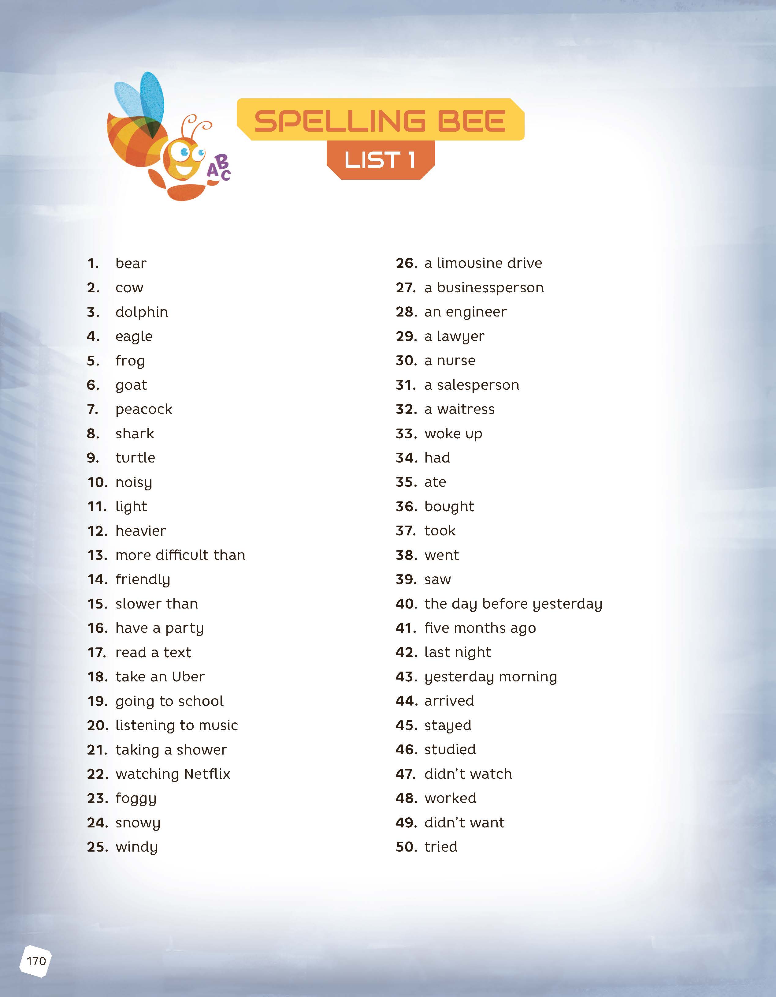 • Remind students to study again the Spelling Bee List 1 (1–25), page 170, at home, to prepare themselves for the Spelling Bee Practice 1, which is happening the following class.