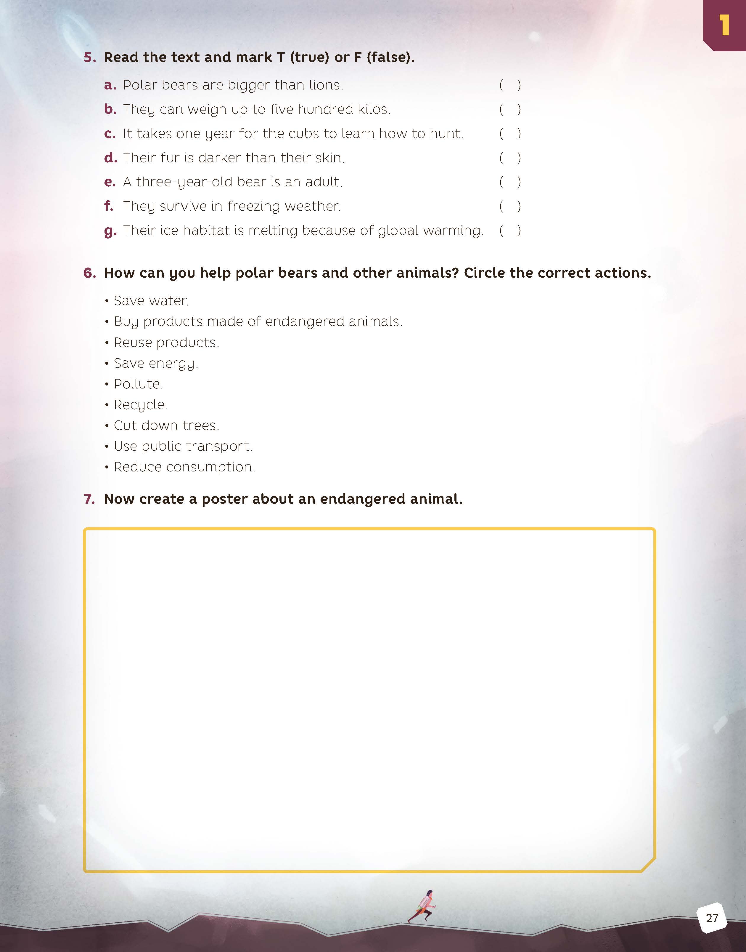 • Exercise 7: Ask students to research on an endangered animal to create a poster about it. Students may use the table on page 27 to take notes about the animal.