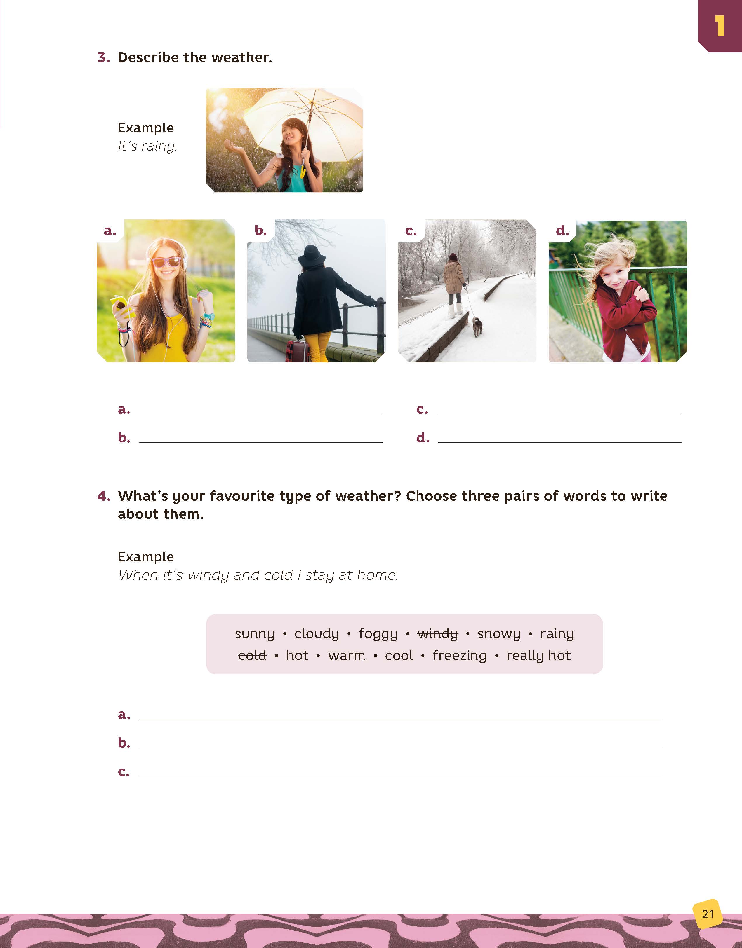 • Open the Workbook to page 21 and explain the exercises to students. Tell them that they’re going to do some exercises to practise the content learnt in class. They should refer to the Student’s Book if they have any questions. Clarify any questions they might have about the exercises.